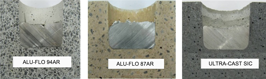 中鑄耐火®生產(chǎn)用于鋁加工工業(yè)高溫設備的全套耐火材料, 產(chǎn)品應用領域涵蓋了鋁加工工業(yè)所有與鋁液相關的高溫設備。如鋁合金熔煉保溫爐、鋁水流槽、過濾箱、除氣箱和鋁水包等。 其中多個產(chǎn)品具有非常創(chuàng)新性的材料設計和使用效能。推薦所有與鋁水接觸的部位使用中鑄耐火含有復合抗粘劑的低水泥澆注料作為工作爐襯。 我們對所有與鋁水接觸部位材料都進行了鋁水坩堝侵蝕實驗,通過嚴格的測試選擇最佳的材料結(jié)構(gòu)設計和獨特的復合抗粘鋁抗粘劑,材料在950℃以內(nèi)具有很好的抗鋁水滲透性能(見下圖),在1200 ℃以內(nèi)仍然具有一定的抗粘鋁性能。